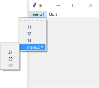 import tkinter if __name__ == '__main__': def dummy(string): print(string) root = tkinter.Tk() menu = tkinter.Menu(root) root.configure(menu=menu) menu1 = tkinter.Menu(menu) menu1.add_command(label="11", command=lambda x=11: dummy(x)) menu1.add_command(label="12", command=lambda x=12: dummy(x)) menu1.add_command(label="13", command=lambda x=13: dummy(x)) menu2 = tkinter.Menu(menu1) menu2.add_command(label="21", command=lambda x=21: dummy(x)) menu2.add_command(label="22", command=lambda x=22: dummy(x)) menu2.add_command(label="22", command=lambda x=23: dummy(x)) menu.add_cascade(label="menu1", menu=menu1) menu1.add_cascade(label="manu2", menu=menu2) menu.add_command(label="Quit", command=root.quit) tkinter.mainloop()
